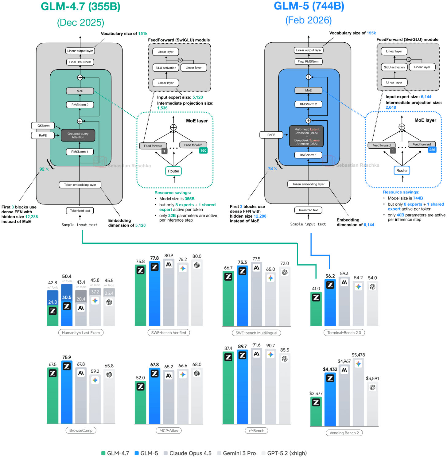 Figure 18: GLM-5 architecture next to its GLM-4.7 predecessor. Benchmarks at the bottom taken from the official GLM-5 technical report.