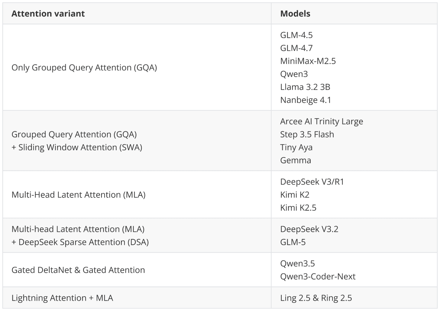 That said, architectural design remains an essential part of building a successful LLM, and many developers seem to be steering towards adding more and more computational performance tweaks. For example, this includes adapting MLA (Kimi K2.5, GLM-5, Ling 2.5) and DeepSeek Sparse Attention (GLM-5) to continue the Gated DeltaNet (Qwen3.5) or similar forms of linear attention (Ling 2.5).