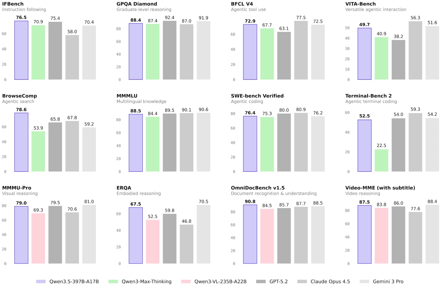 Qwen3.5 397B-A17B, a Mixture-of-Experts (MoE) with 397B parameters (17B active per token), is a step up from the largest Qwen3 model, which is 235B parameters in size. (There is also the 1 trillion-parameter Qwen3-Max model, but it was never released as an open-weight model.)
