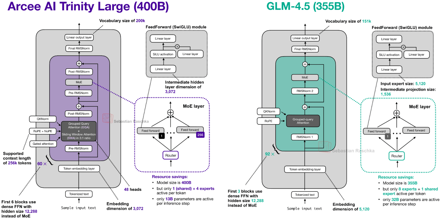 As we can see in the Trinity and GLM-4.5 comparison, there are several interesting architectural components added to the Trinity model.