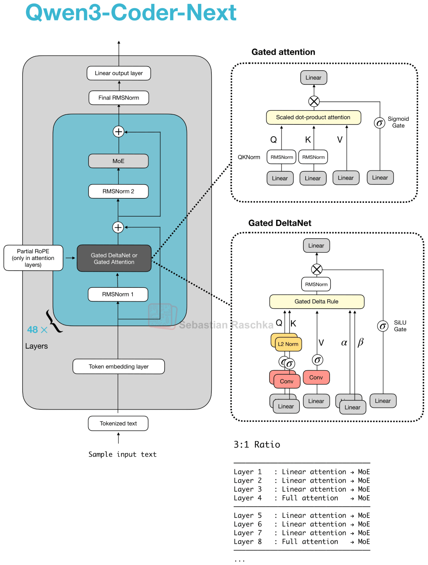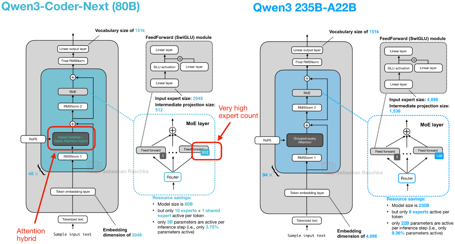 Note that the architecture behind Qwen3-Coder-Next is exactly the same as Qwen3-Next 80B (in fact, the pre-trained Qwen3-Next 80B is used as a base model for further mid- and post-training). Figure 16 below shows the Qwen3-Next architecture next to a regular Qwen3 235B model for reference.