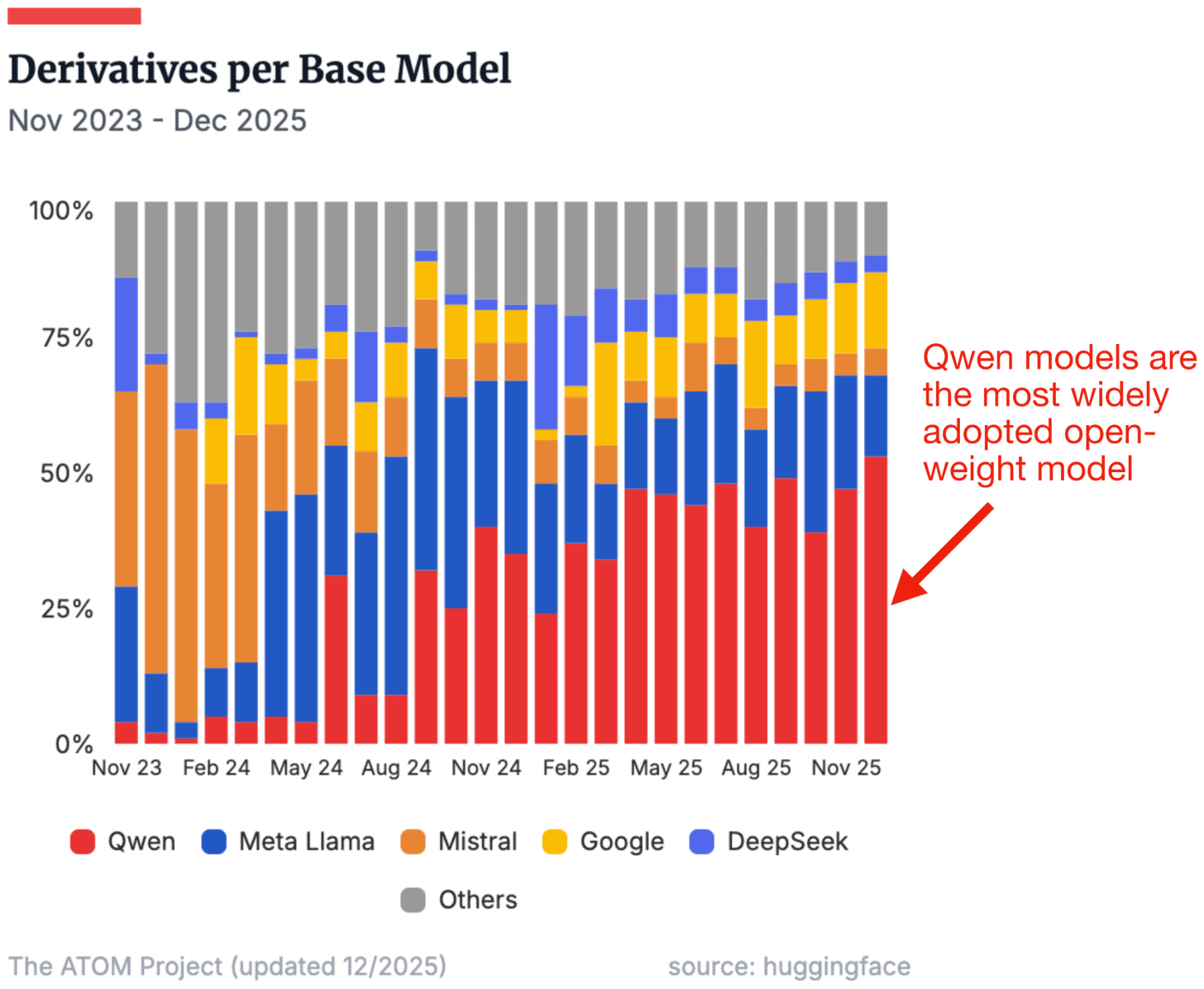 Figure 27: Relative adoption popularity of open-weight models. Note that this shows the number of models on the Hugging Face model hub that are finetuned using one of those models as a base model. (This is not the number of people who use the models on their computer locally, which would be a number impossible to know.) Source: Atom Project.