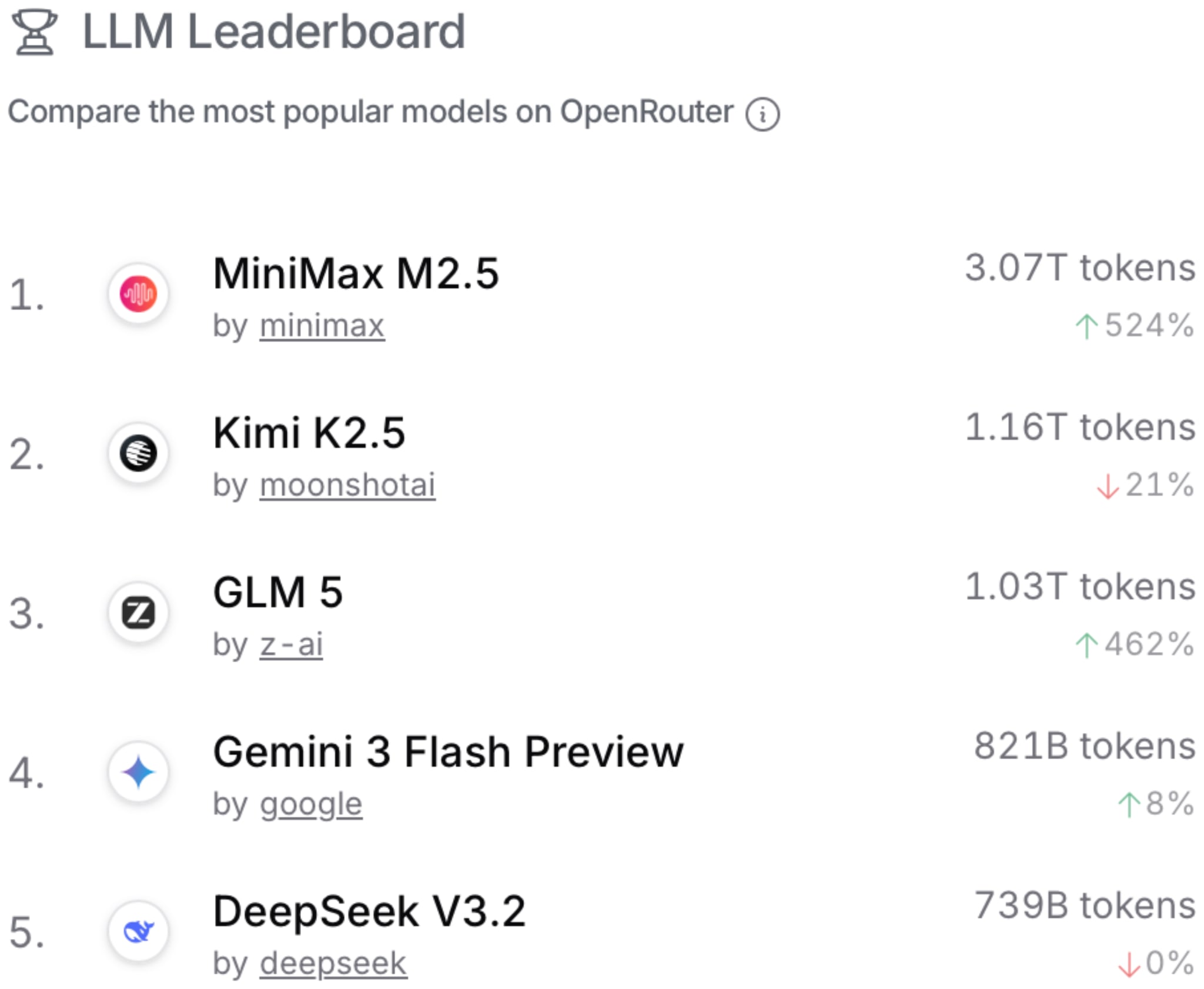 The aforementioned GLM-5 and Kimi K2.5 are popular open-weight models, but according to OpenRouter statistics, they pale in comparison to MiniMax M2.5, which was released on February 12 as well.