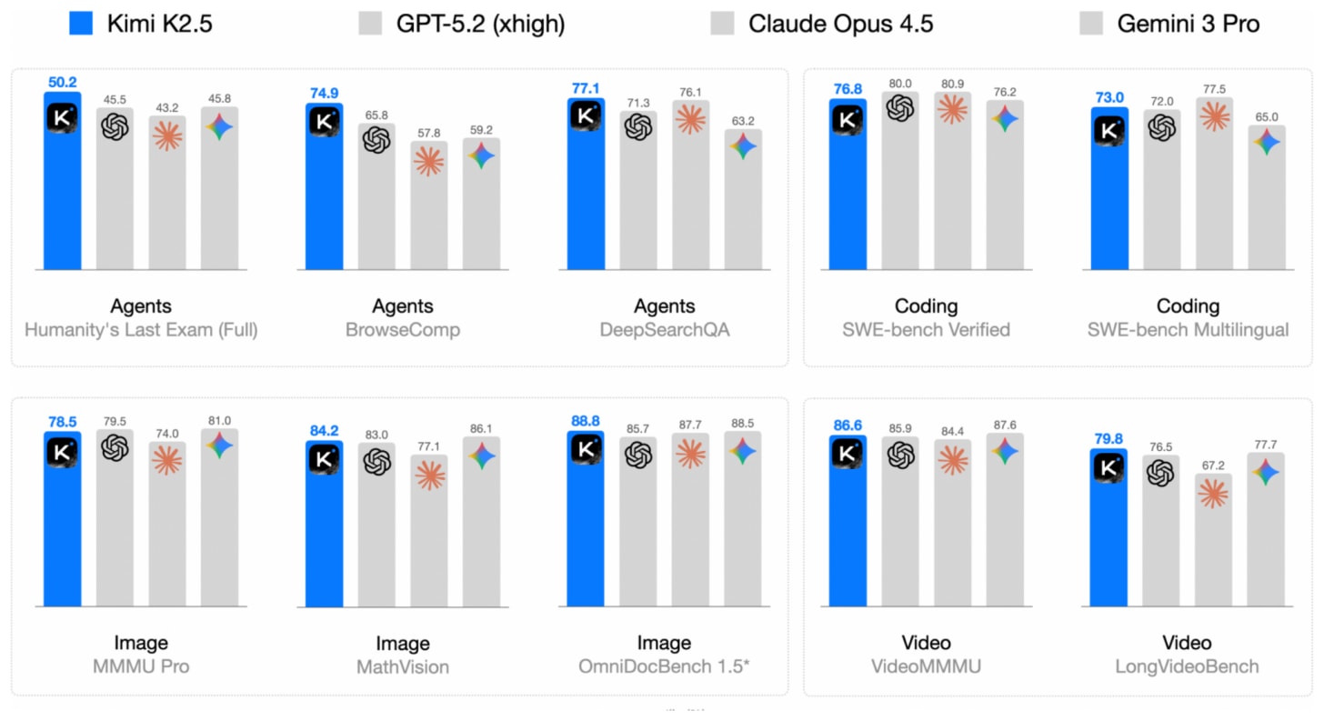 Figure 7: Kimi K2.5 performance benchmark from the official K2.5 technical report.