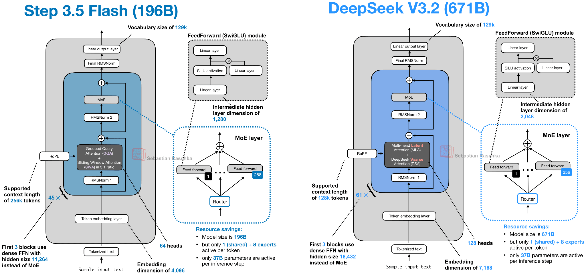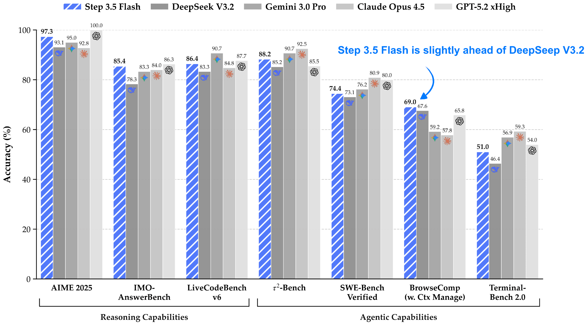 Step 3.5 Flash is a 196B parameter model that is more than 3x smaller than the recent DeepSeek V3.2 model (671B) while being slightly ahead in modeling performance benchmarks. According to the Step team, Step 3.5 Flash has a 100 tokens/sec throughput at a 128k context length, whereas DeepSeek V3.2 has only a 33 tokens/sec throughput on Hopper GPUs, according to the data on the Step model hub page.