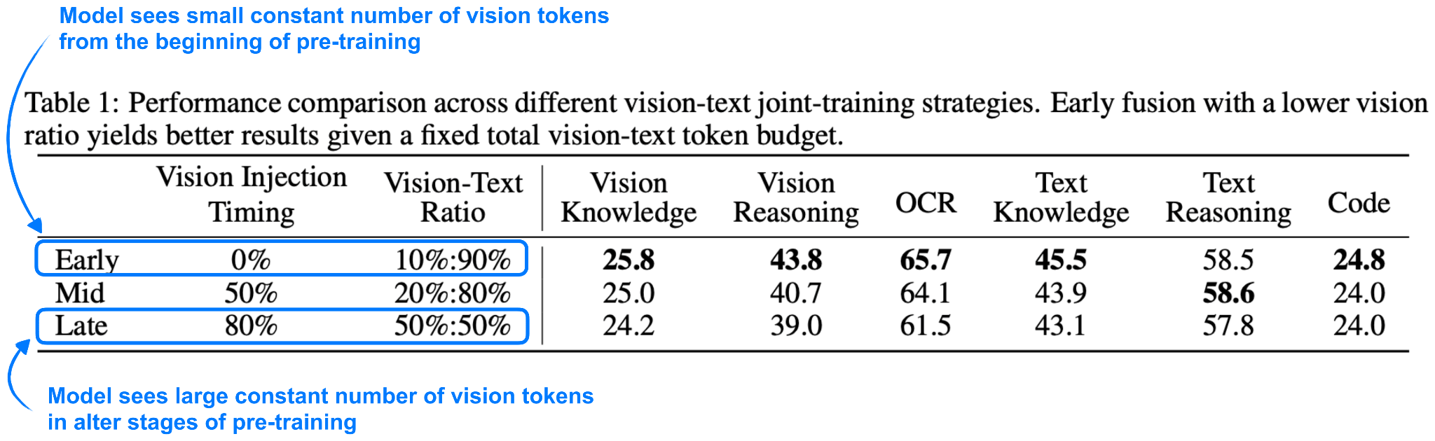 Furthermore, regarding point 1, the researchers included an interesting ablation study showing that the model benefits from seeing vision tokens early in pre-training, as shown in the annotated table below.