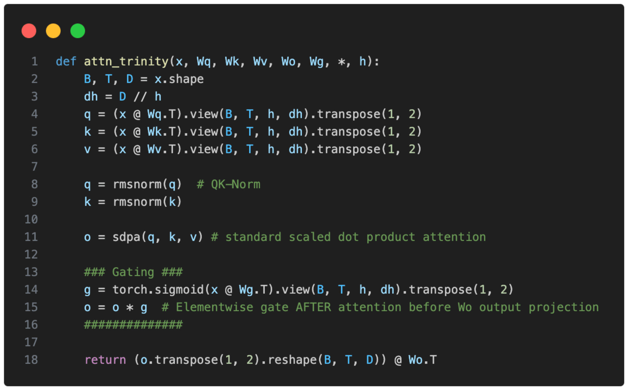 We can think of the gated attention block as standard scaled-dot-product attention used in GQA, with a few tweaks on top. The main differences between gated attention and plain GQA block are:
