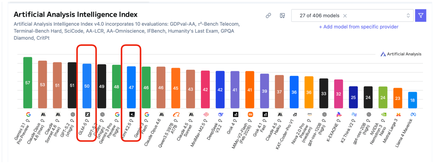 Furthermore, looking at the most recent Artificial Intelligence Index, which aggregates various benchmarks, GLM-5 is indeed slightly ahead of Kimi K2.5 and only one point behind GPT-5.2 (xhigh) and the recent Claude Sonnet 4.6.