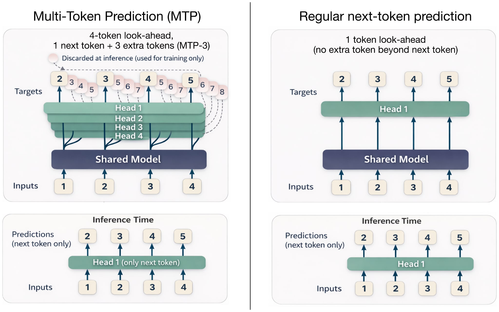 Figure 13: Multi-Token Prediction versus regular next token prediction. (Left subfigure inspired by the MTP paper.) Originally, MTP was only used during training, not inference; hence, the inference time steps (bottom) show a single next-token prediction.