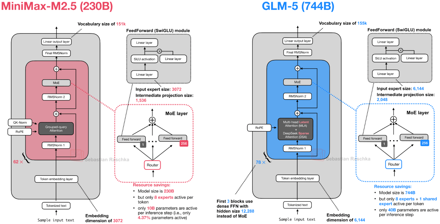Architecture-wise, MiniMax M2.5 is a 230B model with a fairly classic design: just plain Grouped Query Attention, no sliding window attention or other efficiency improvements.