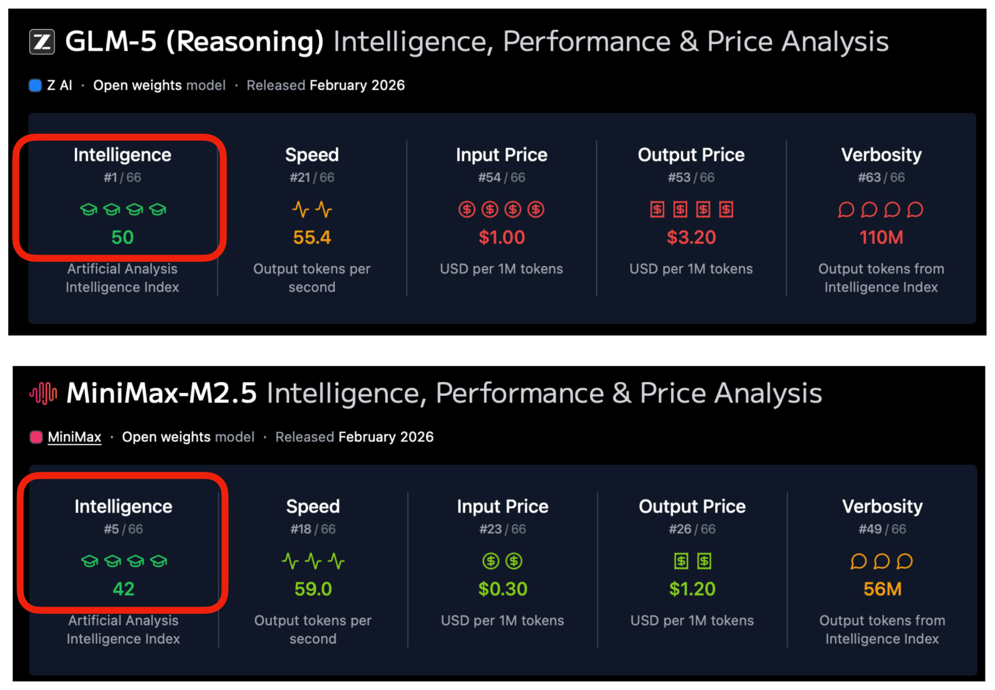 Figure 25: GLM-5 vs MiniMax M2.5 comparison based on the Artificial Intelligence Index (Feb 21, 2026)