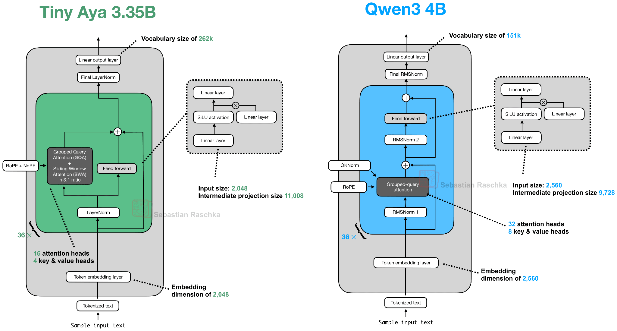 For those readers familiar with Cohere’s Command-A architecture, Tiny Aya seems to be a smaller version of it. Also, an interesting detail is that the Tiny Aya team dropped QK-Norm (an RMSNorm applied to keys and queries inside the attention mechanism); QK-Norm has become quite standard for improving training stability in terms of reducing loss spikes. According to a developer on the Cohere team, QK-Norm was dropped “since it can interact with long context performance.”