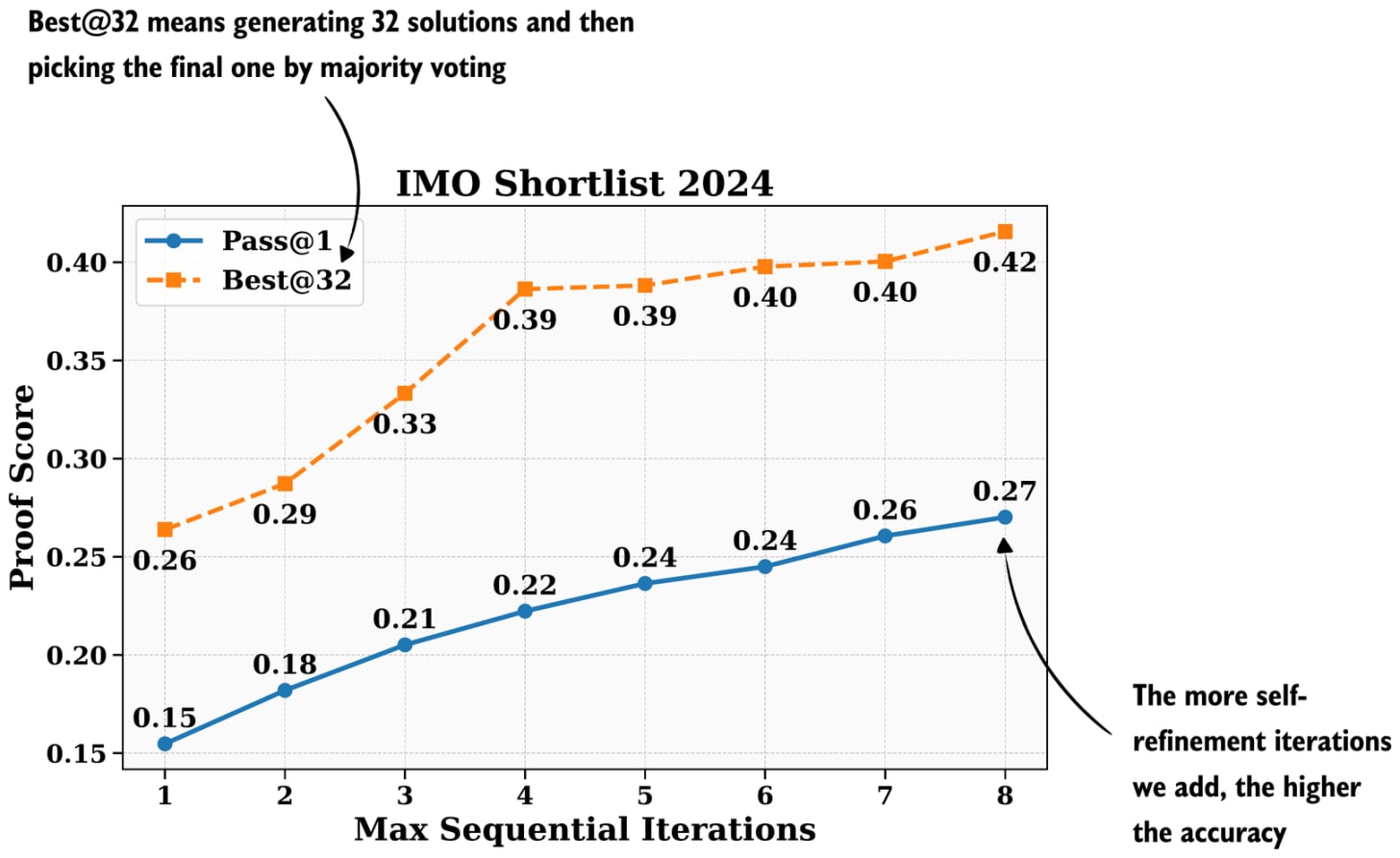 Coming back to the general self-refinement concept shown in Figures 14 and 15, both figures show self-refinement with 2 iterations (the initial one and a refined answer). Of course, we can add more iterations to this process. It’s a classic inference-scaling trade-off: the more iterations we add, the more expensive it becomes to generate the answer, but the higher the overall accuracy.