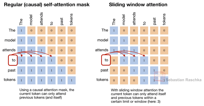 To explain how it works, let’s start with sliding-window attention. For instance, sliding window attention is a technique (recently used by Gemma 3 and Olmo 3) that limits the attention window to a fixed size, as illustrated in the figure below.