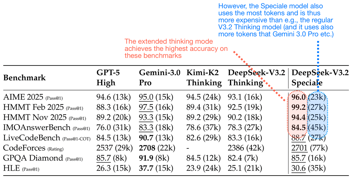 DeepSeek V3.2 also comes in an extreme, extended-thinking variant called DeepSeek V3.2-Speciale, which was trained only on reasoning data during the RL stage (more akin to DeepSeek R1). Besides training only on reasoning data, they also reduced the length penalty during RL, allowing the model to output longer responses.