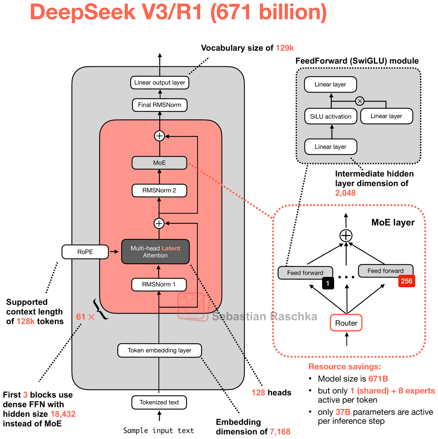 I already discussed DeepSeek V3 and R1 in great detail in several other articles. To summarize the main points, DeepSeek V3 is a base model that uses two noteworthy architecture aspects: Mixture-of-Experts (MoE) and Multi-Head Latent Attention (MLA).