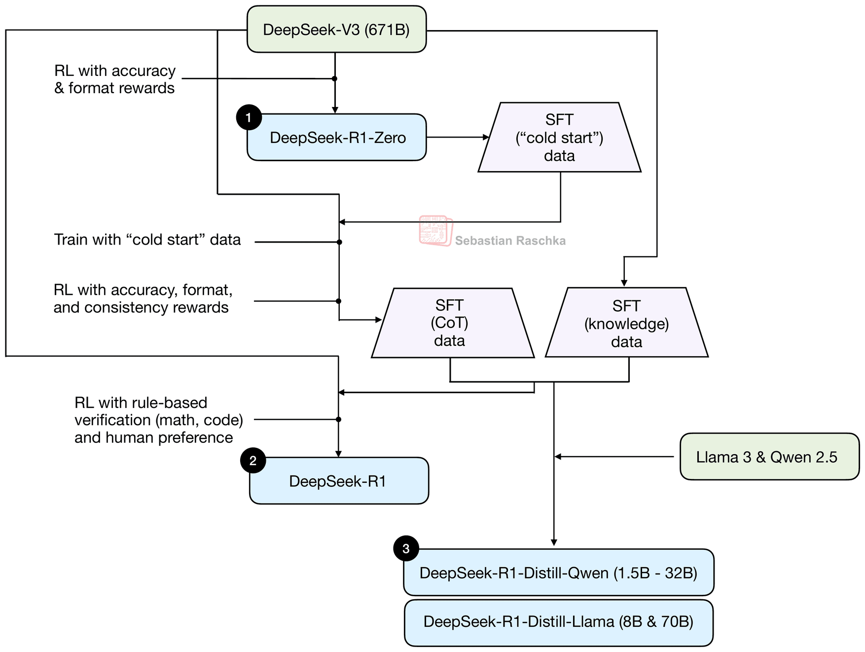 You can read more about the training pipeline in the figure above in my Understanding Reasoning LLMs article.
