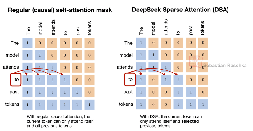 DSA is based on the same idea as sliding-window attention: only a subset of past tokens can be attended to. However, instead of selecting the tokens that can be attended via a fixed-width sliding window, DSA has an indexer and token selector to decide which past tokens can be attended. In other words, the tokens that can be attended are more random, as illustrated in the figure below.