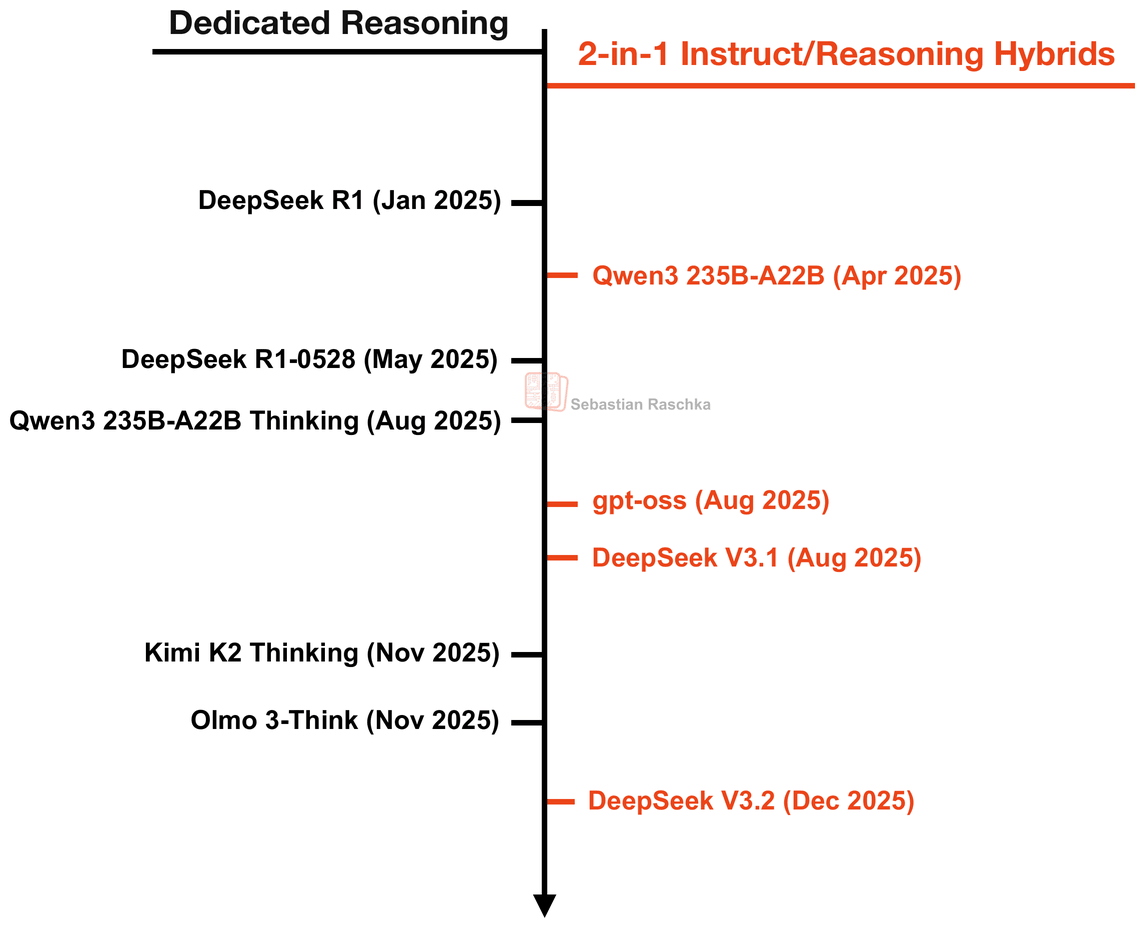 And in the case of DeepSeek, it looks like they moved in the opposite direction from a dedicated reasoning model (R1) to a hybrid model (V3.1 and V3.2). However, I suspect that R1 was mainly a research project to develop reasoning methods and the best reasoning model at the time. The V3.2 release may be more about developing the best overall model for different use cases. (Here, R1 was more like a testbed or prototype model.)