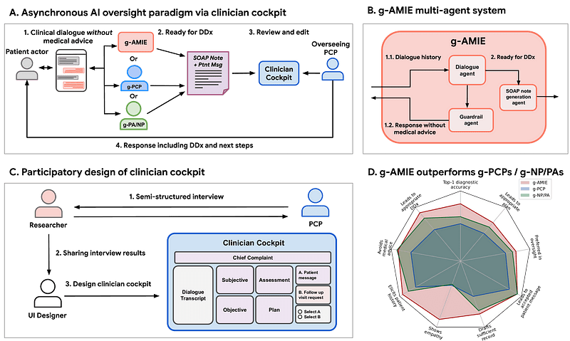 The solution introduces asynchronous oversight — a framework where AI systems can conduct comprehensive patient interviews but must defer all individualized medical advice to licensed physicians. This approach, built around the Articulate Medical Intelligence Explorer (AMIE), creates a clear separation between information gathering and medical decision-making.