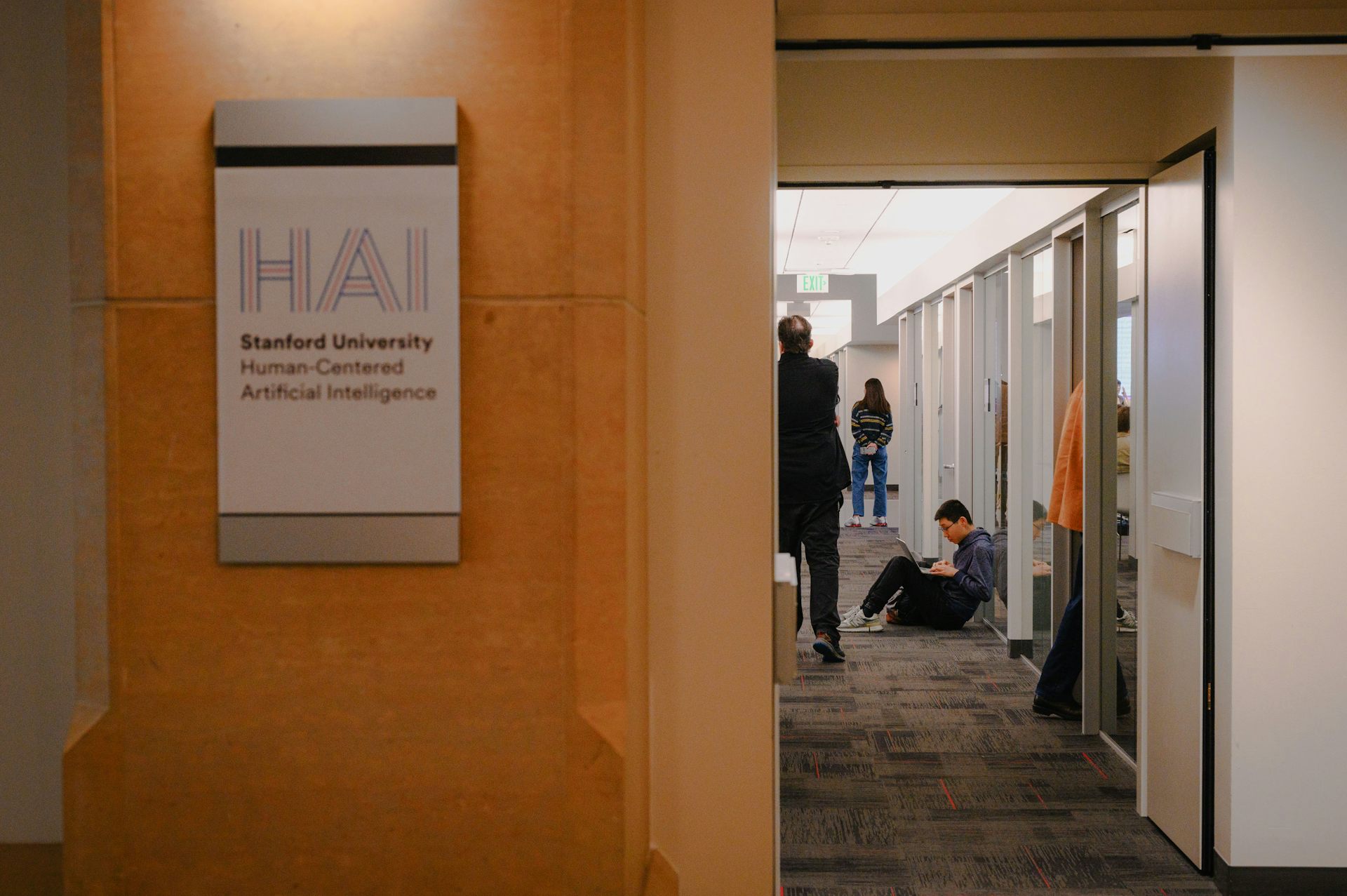 People are seen down a hallway, near a sign on a wooden wall that says 'Stanford University Human-Centered Artificial Intelligence.'