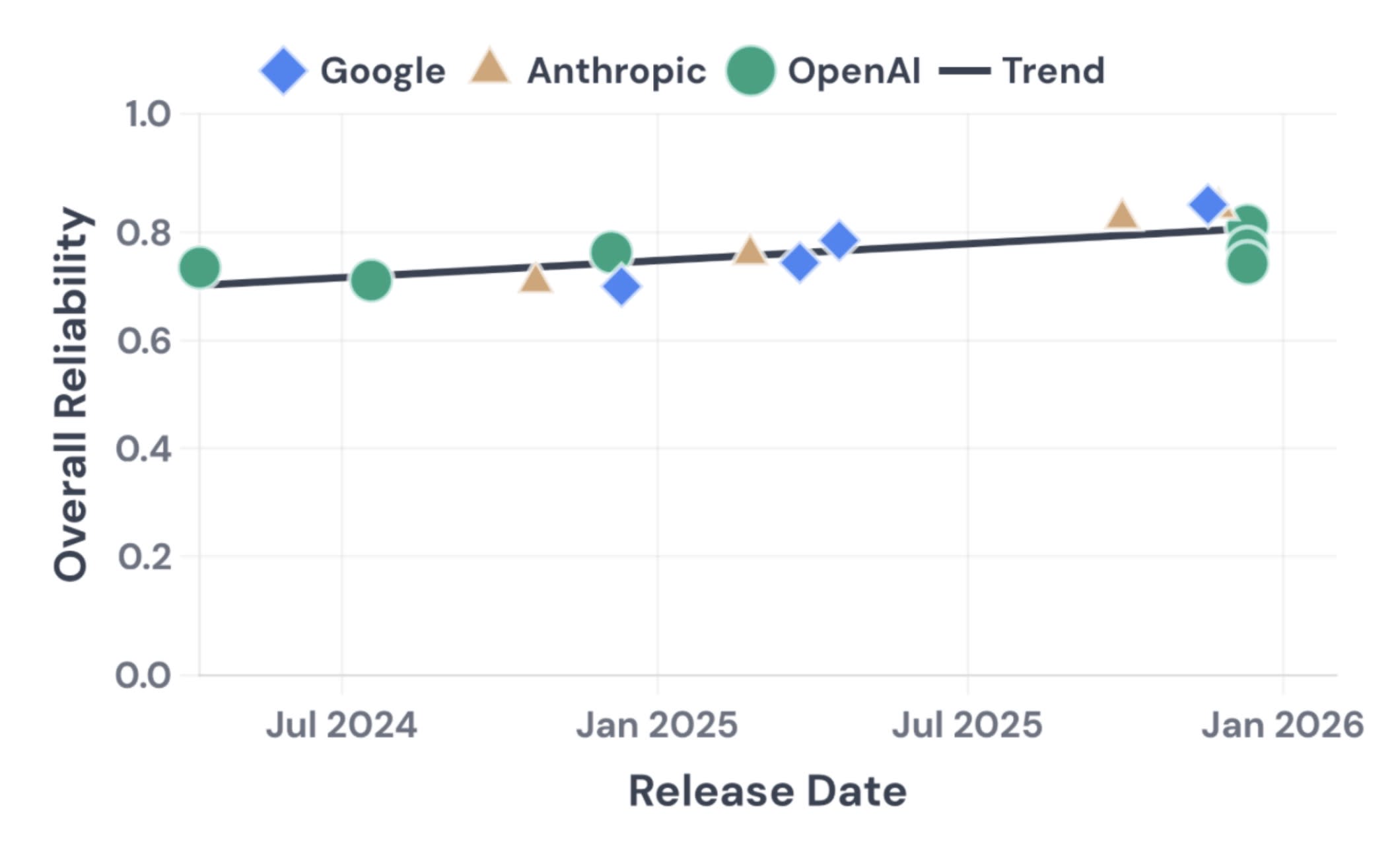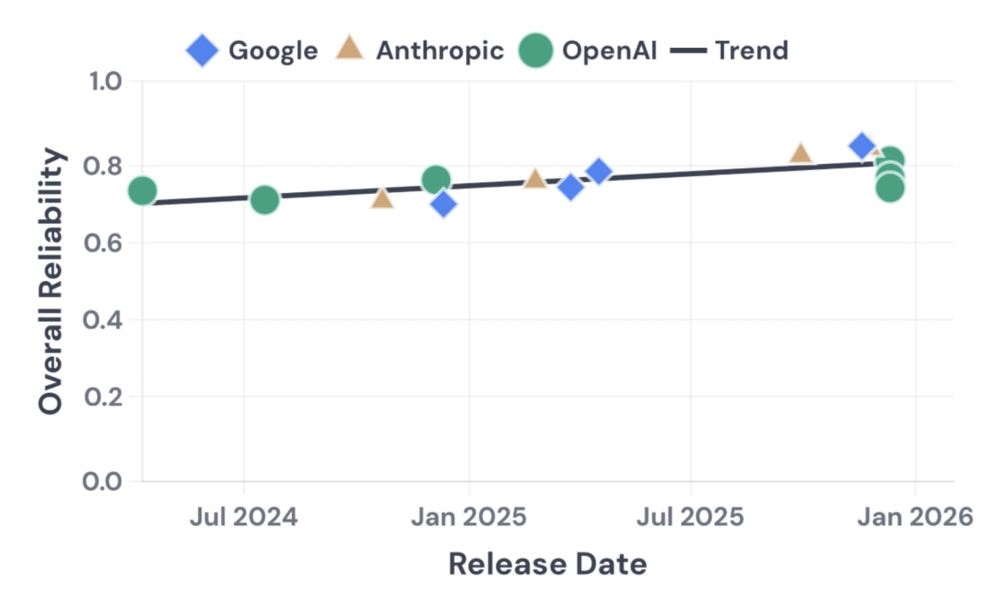 We found that reliability has improved only modestly over 18 months, while accuracy improved substantially. All three major providers cluster together, so this appears to be an industry-wide limitation (though there are some cases where Anthropic’s models outperform OpenAI’s and Google’s).