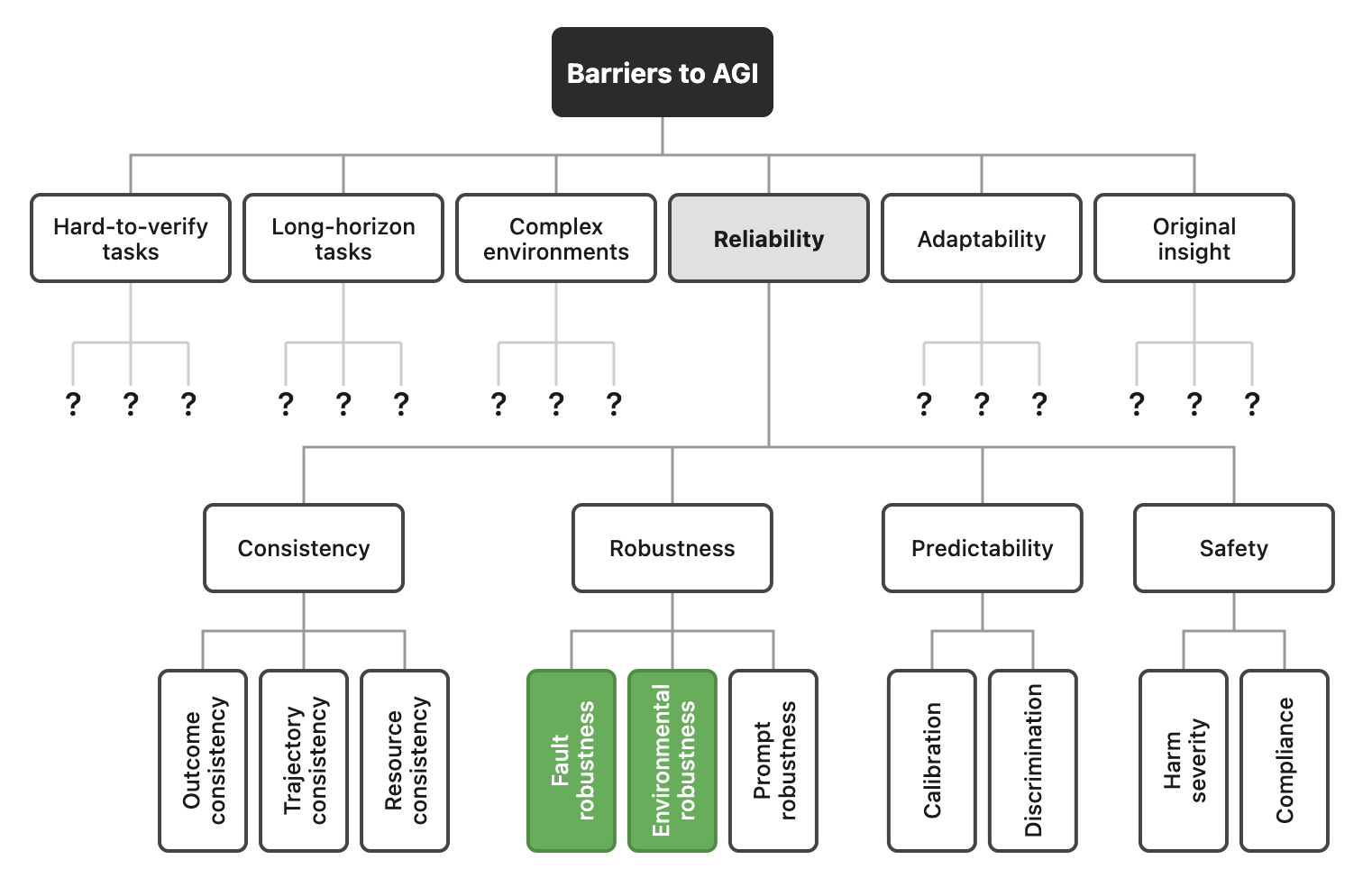 Our paper can be seen as putting flesh on the bones of one of these barriers — reliability. None of the four dimensions we identify can be considered solved at this point in time, and only two of the individual metrics, shown in green in the figure, can be considered (tentatively) solved.